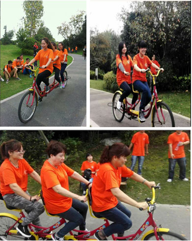 吃过午饭后分配晚上住宿房间,所以人适当午休,下午2点钟集合,我们又一起坐大巴去桃花岛在一个湖边进行了二人自行车和三人自行车的比赛,比赛的规则是 大概有100米,从起点到目的地,比每组骑的速度慢用时长的获胜。经过激烈的比赛,大概持续了3个小时,后分出了 2人和3人的,祝贺骑2人3人自行车获胜的小伙伴们。