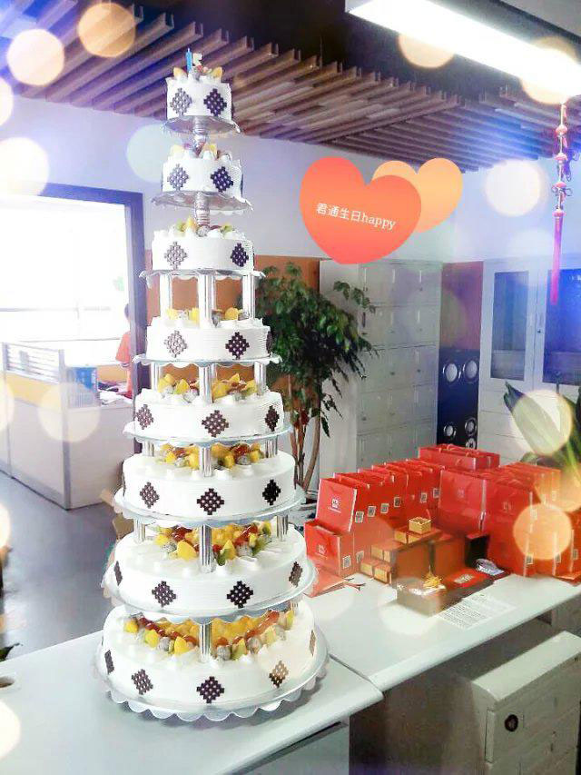 下午伴随着生日蛋糕的上场,我们君通的生日会马上要开始了,全体君通人精神焕发迎接着这神圣的时刻!君通人不仅每位都可以享用到美味的蛋糕,并且满1年以上、满2年以上。。。直至公司元老满15年以上的都有公司颁发的印有公司logo的精美纪念品,尹总作为我们君通这个大家庭的大家长不仅给予我们营养让我们成长、在公司生日当天还送礼物给我们,应该是我们送礼物庆祝公司生日才对,真的是让好多君通人感动不已,尹总、冬梅姐、秦姐、张经理、邓总、王经理等都不尽感动落泪,让我想到了我常跟家人同学朋友们说的一句话:是我的公司见证了我的成长与发展!