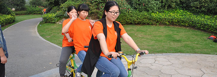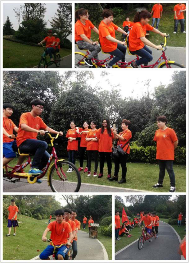 说到快乐,不得不说下午的三人自行车和二人自行车比赛,走,去瞧瞧他们的赛况,尹总和张会计宋经理来参赛了: