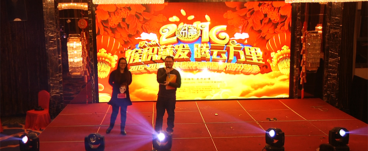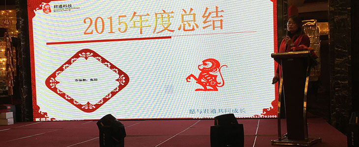 在万众期待与瞩目中,伴随着《厚积薄发*腾云万里》的绚烂LED电子背景、主持人阿杜徐步走上台宣布君通杯2015年度总结大会暨年度颁奖盛典正式开始!
