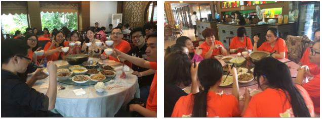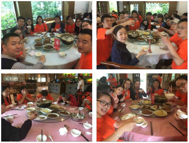离开茶岛,大家乘船来到了的第三站:天目湖水世界。由于这半天的时间大家一直处于很嗨的状态,所以玩的有些忘记时间了,等到了午餐餐的地点夕照湾酒店的时候都已经下午一点半了,饥饿感随之而来,带着这份饥饿感,大家用心的品尝着天目湖的特色鱼头汤,瞬间觉得幸福来的如此的容易,看看大家脸上的笑容和狼吞虎咽的样子知道了: