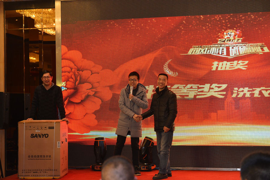 在晚会过程中,火爆的抽奖活动穿插进行,特等大奖洗衣机由技术部卢啸啸获得为扩大中奖面,尹总、康总等领导今年增加了现金中奖名额,现场不时爆发出惊喜与欢呼声。