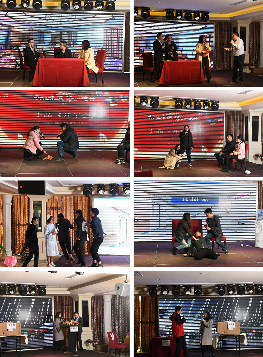 有舞蹈自然也会有语言类节目,技术部和市场部分别带来小品《同学聚会》,《开年会》,《B超风云》,《安检》等诙谐幽默,搞怪有趣的表演也赢得了台下阵阵掌声!