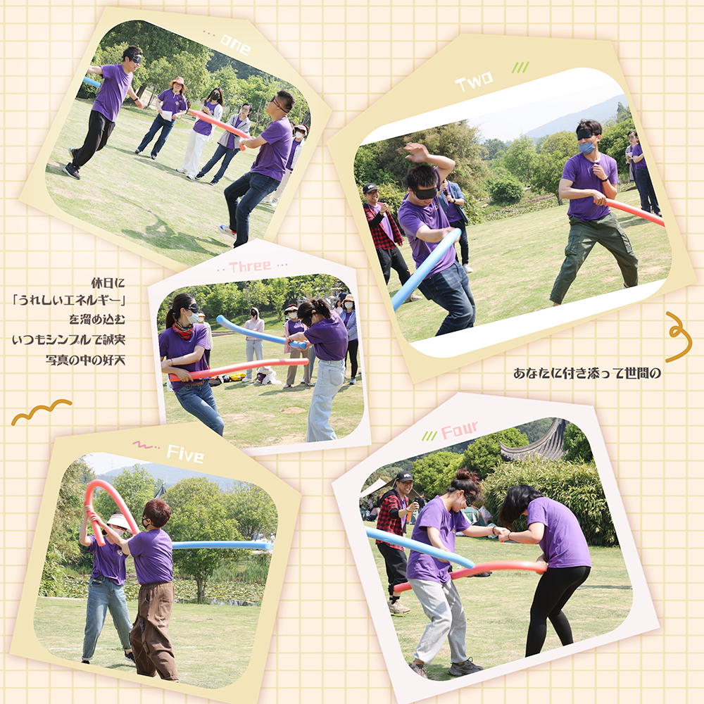 “蒙眼互打、纸杯传水、桃花朵朵开、词语接龙”等同舟共济趣味游戏,体验和小伙伴们在一起时合作的力量与温暖,团结就是力量!