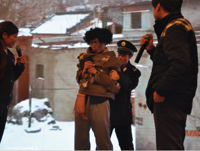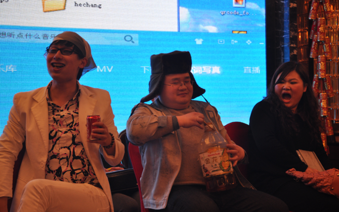 还有一个小品我不得不说啊,眼下,网络词汇为流行是屌丝,二货,今年晚会的有一个新看点,是由设计部带来的《当屌丝遇见二货》,这个节目没有太多的语言或是对话交流,全是采用动作及行为艺术展现出来的,这个节目让我们真正领略了什么是屌丝,什么是二货,参演中爽的是饰演“屌丝”的超哥,苦的了是参演“二货的‘的杜工啦,超哥你吃的是汉堡,喝的是可乐,然“杜工”,你吃的是压在屁股下的馒头加大葱蘸牙膏,喝的是纯正的金龙鱼油啊。我深深的被你们的演出折服了。又是一组强劲的组合!