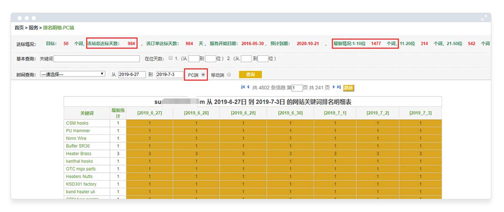 1、该客户与外贸快车合作的第3年,目前总达标天数984天,PC端google.com首页排名1477个关键词,第2页排名314个关键词,移动端的排名也非常优 秀;
