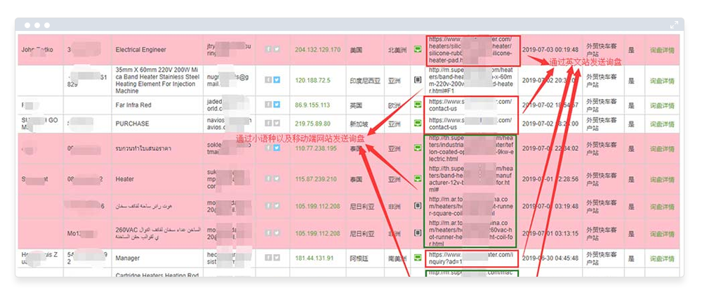 4、截图该客户的部分询盘,发现采购商通过小语种、以及移动端网站发送询盘的占58%,采购商通过英文主站发送询盘占42%,意味着,如果只做英文站的推广,你将会损失掉将过60%的潜在客户!