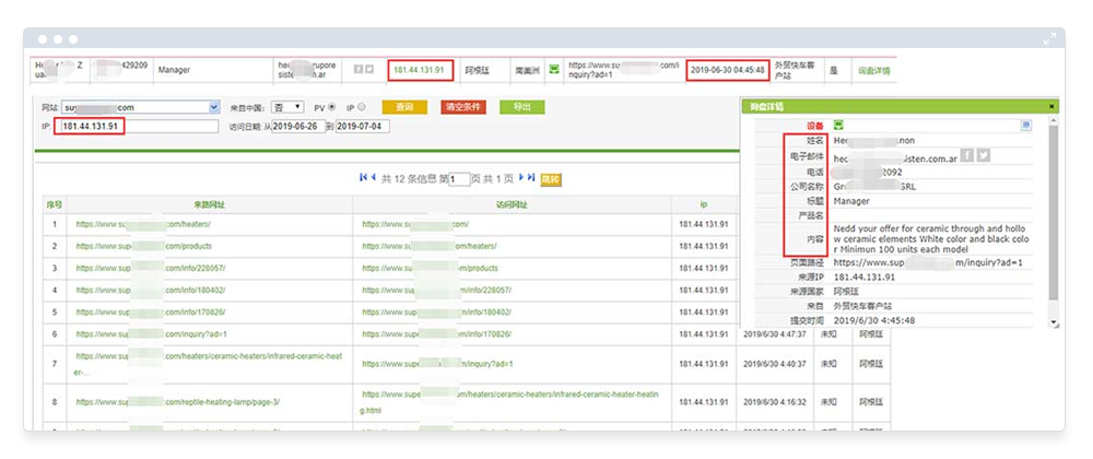 5、我们对其中一个阿根廷询盘的IP进行了分析,发现该采购商是通过google.com英文主站进行关键词搜索后,进到客户的英文网站,首 次访问时间是4:14:39,然后在网站里查看了多个页面,浏览了31分钟后,于4:45:48给客户发送询盘,询盘内容提供姓名,电话,公司名字,邮件以及详细需求;